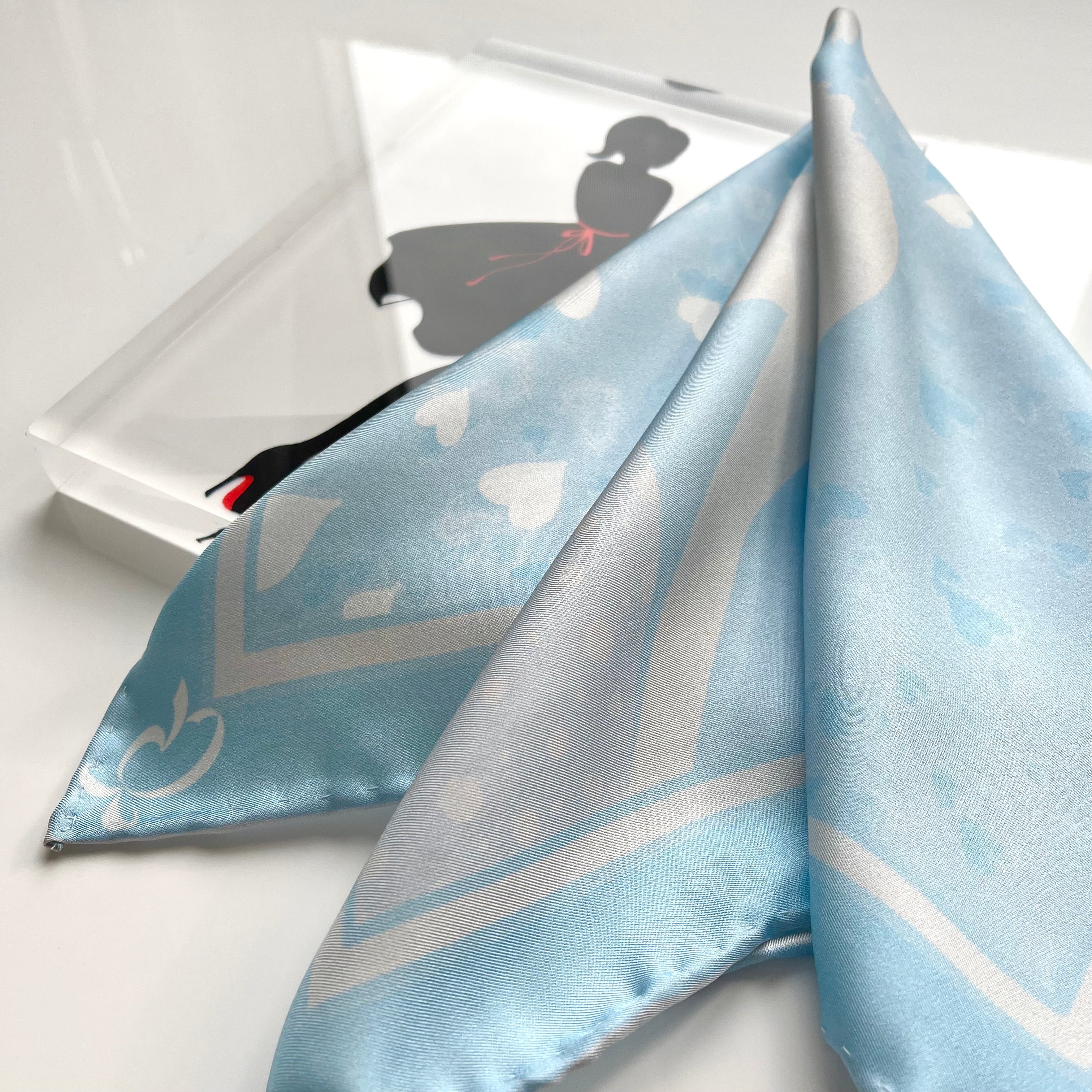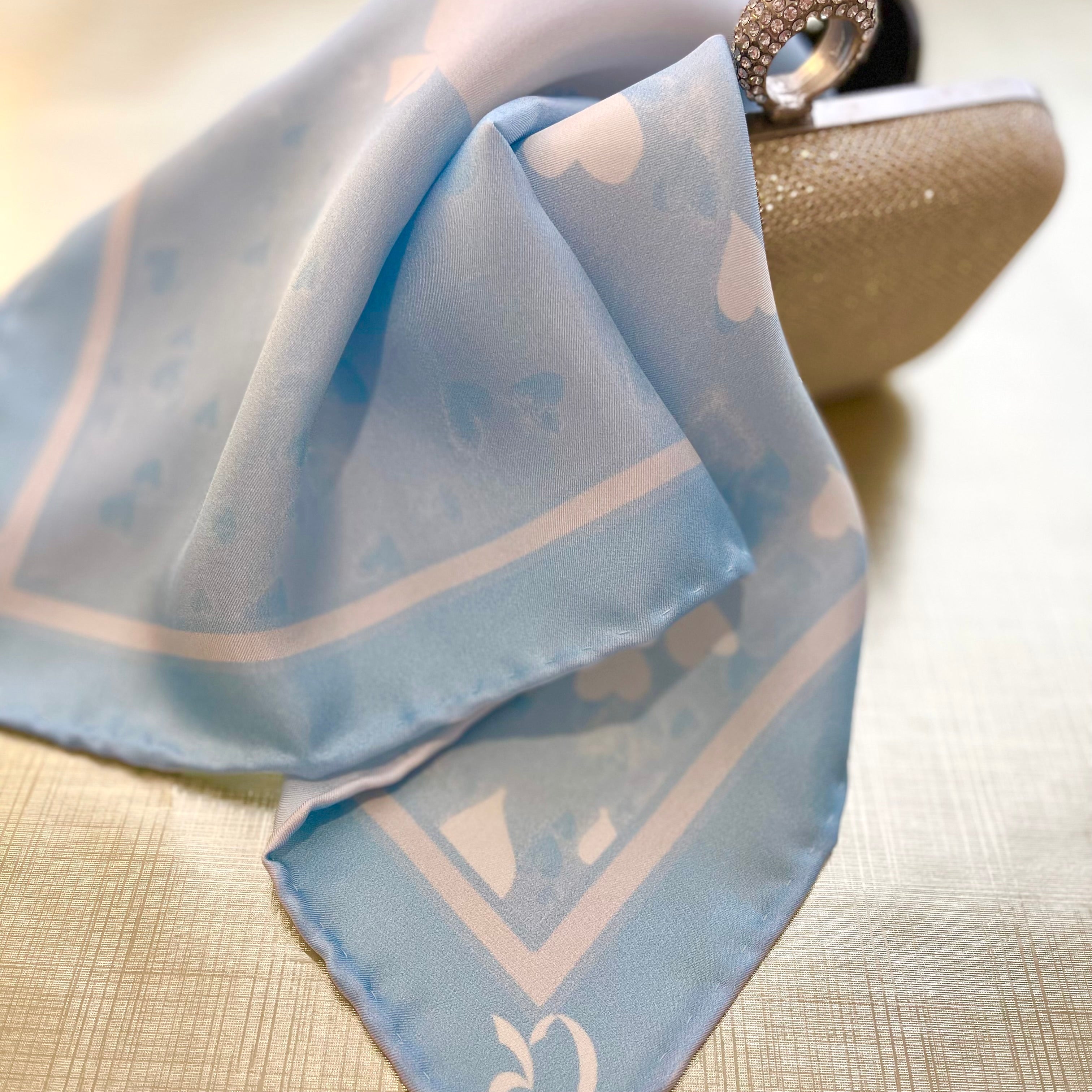 The scarf is made from 100% silk, chosen for its smooth feel, gentle drape, and natural sheen. It measures 34 x 34 inches, making it versatile to wear around the neck, as a headscarf, or styled as an accent. The hand-rolled edges add a refined, couture finish and reflect careful, traditional craftsmanship.