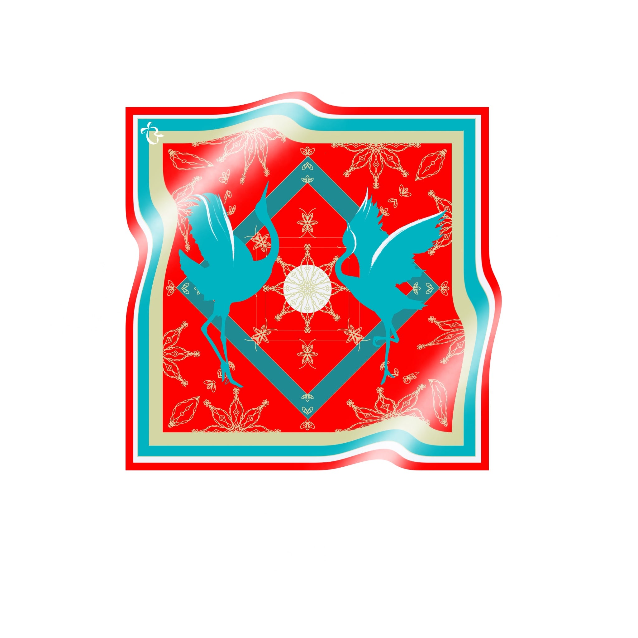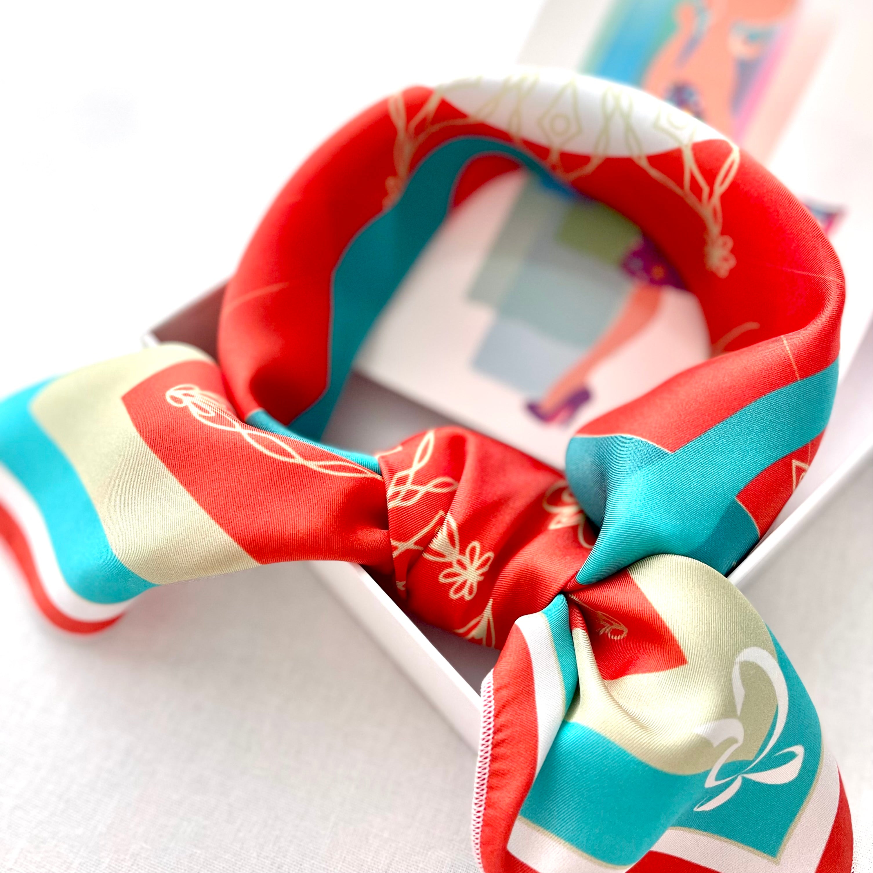 The scarf is made from 100% silk, chosen for its smooth feel, gentle drape, and natural sheen. It measures 34 x 34 inches, making it versatile to wear around the neck, as a headscarf, or styled as an accent. The hand-rolled edges add a refined, couture finish and reflect careful, traditional craftsmanship.