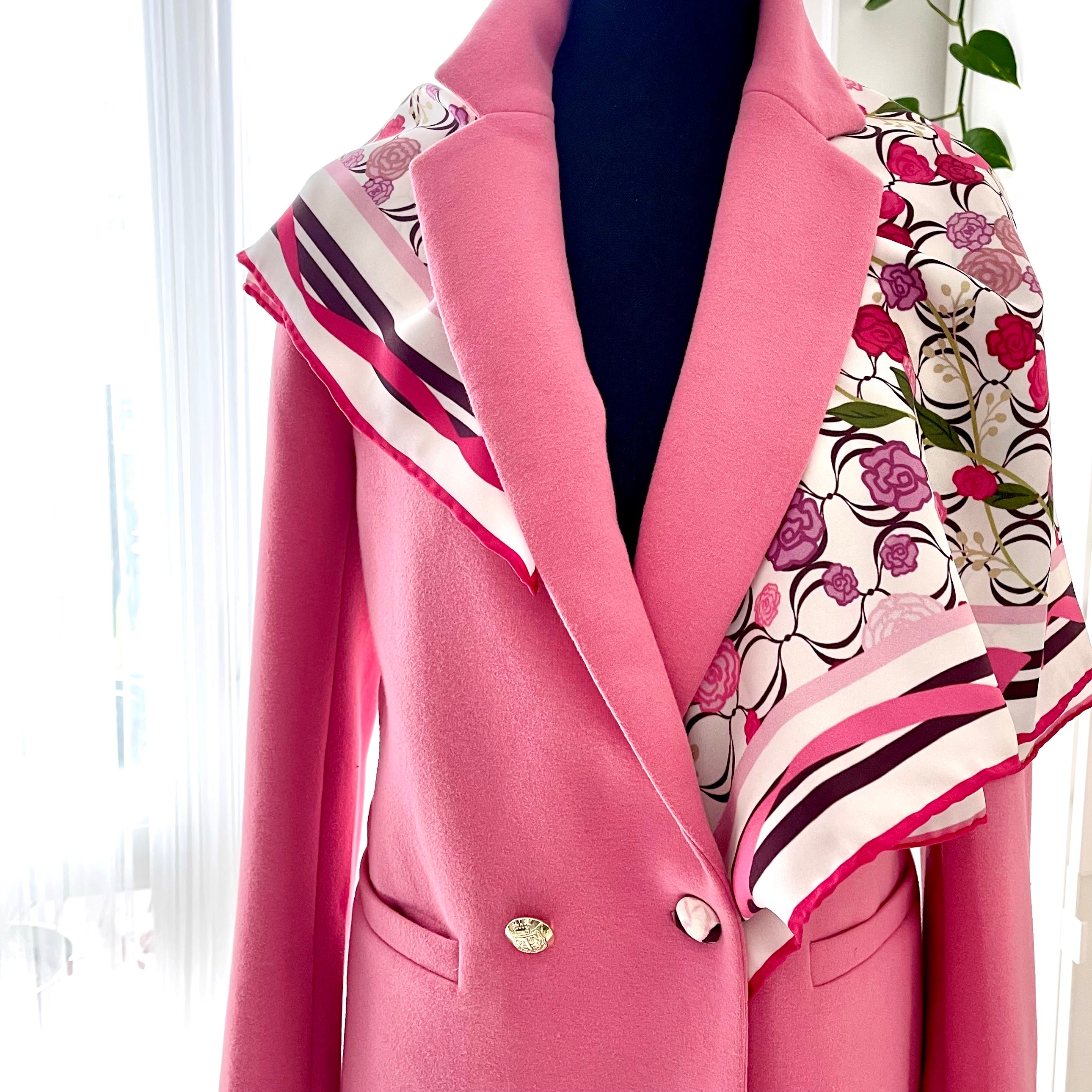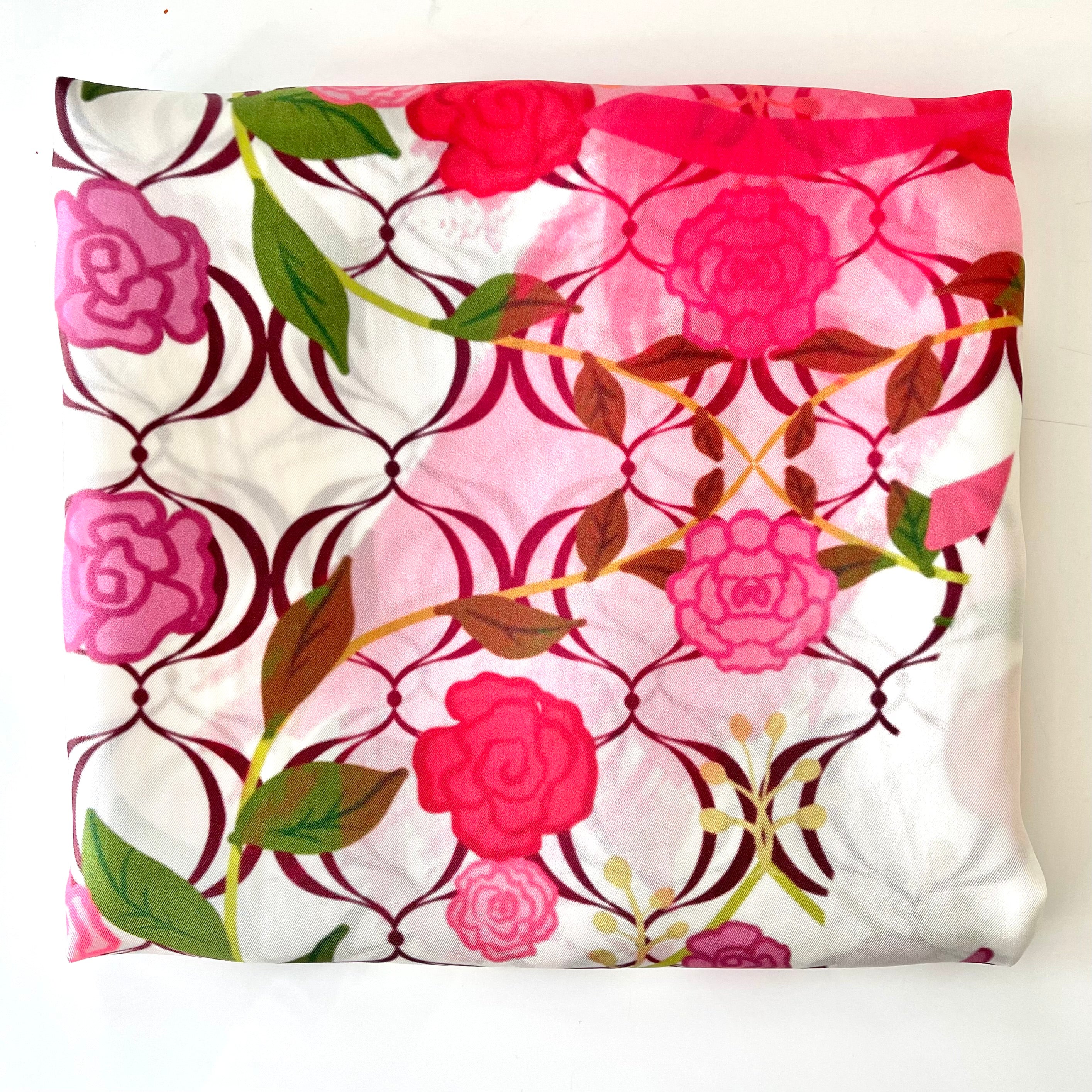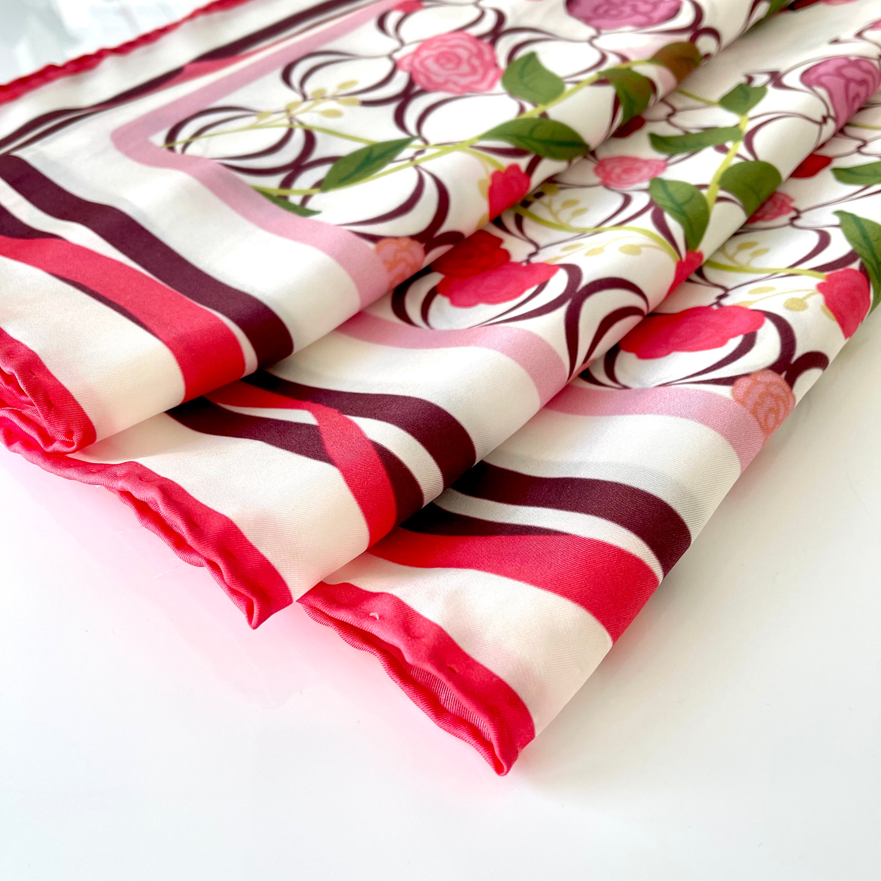 The scarf is made from 100% silk, chosen for its smooth feel, gentle drape, and natural sheen. It measures 34 x 34 inches, making it versatile to wear around the neck, as a headscarf, or styled as an accent. The hand-rolled edges add a refined, couture finish and reflect careful, traditional craftsmanship.