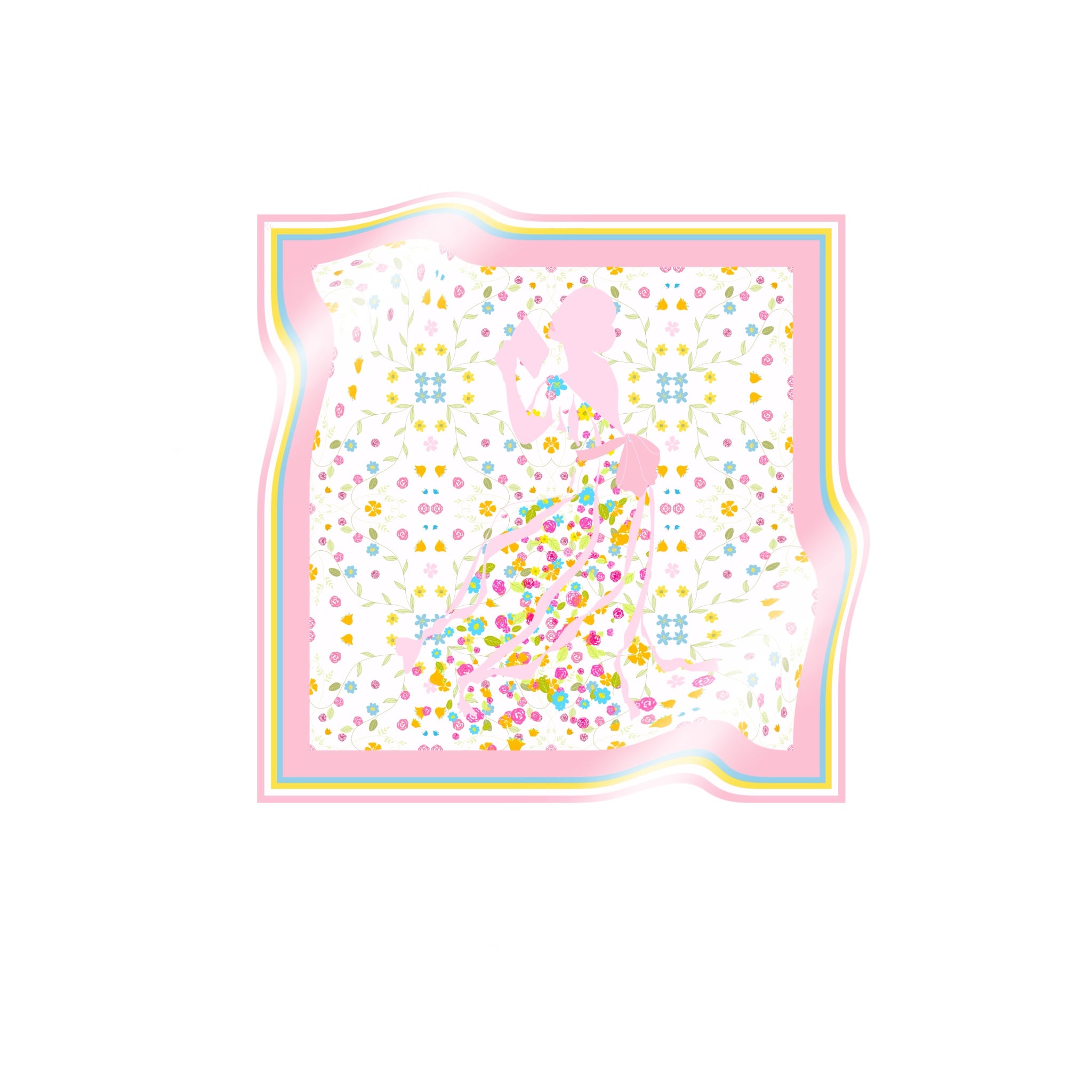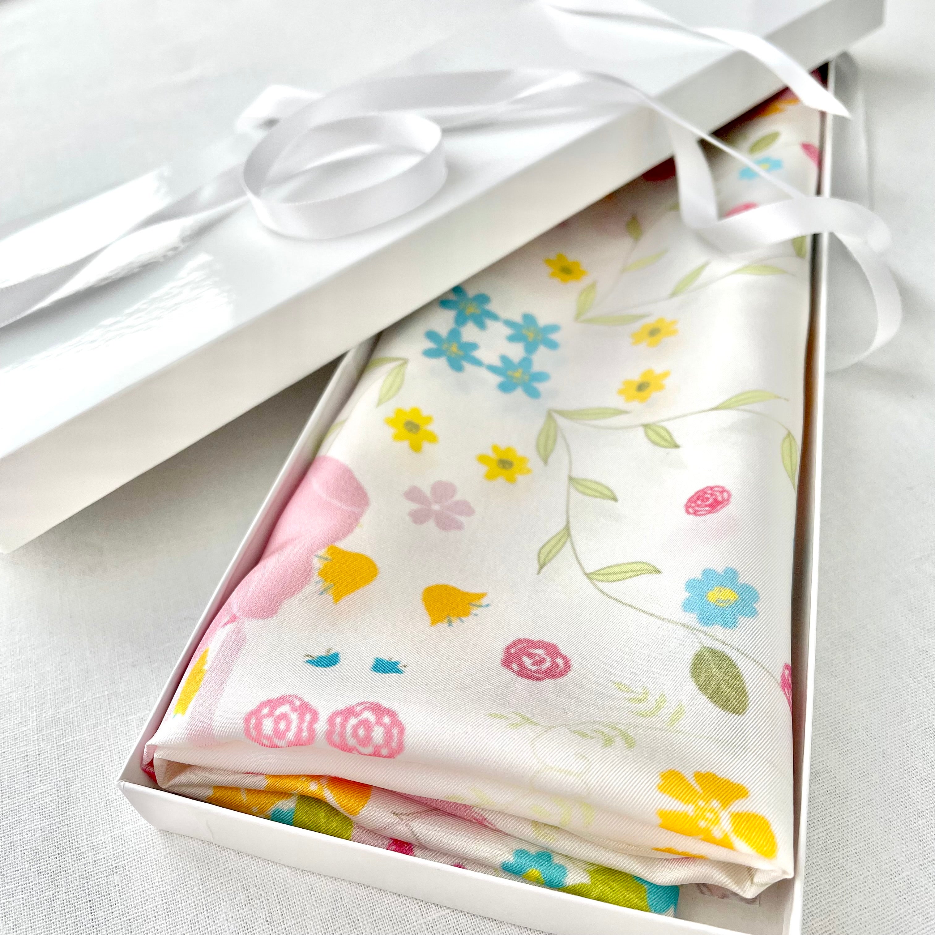 The scarf is made from 100% silk, chosen for its smooth feel, gentle drape, and natural sheen. It measures 34 x 34 inches, making it versatile to wear around the neck, as a headscarf, or styled as an accent. The hand-rolled edges add a refined, couture finish and reflect careful, traditional craftsmanship.
