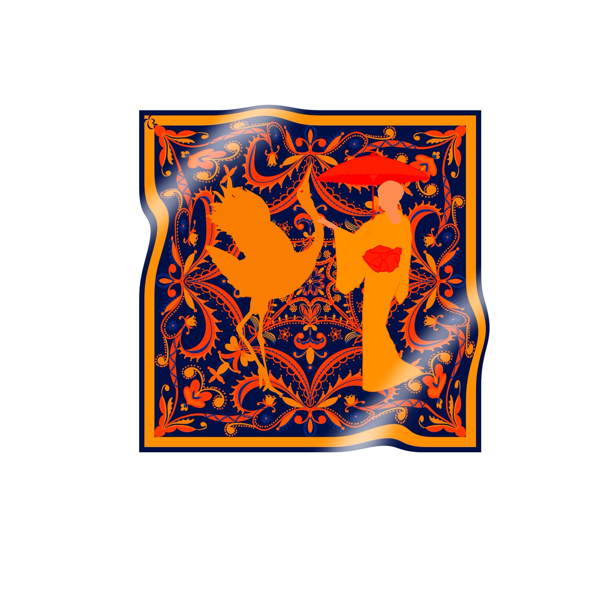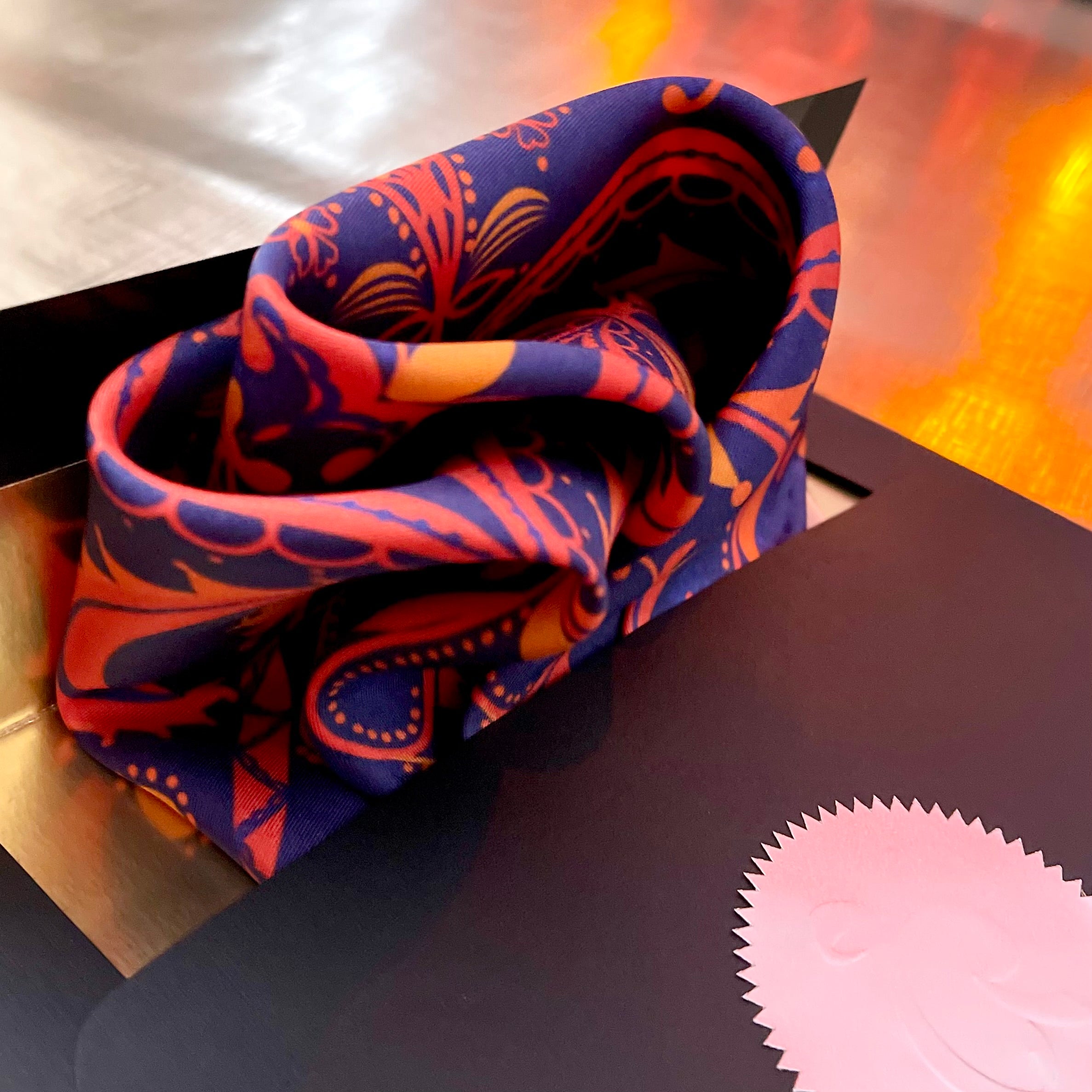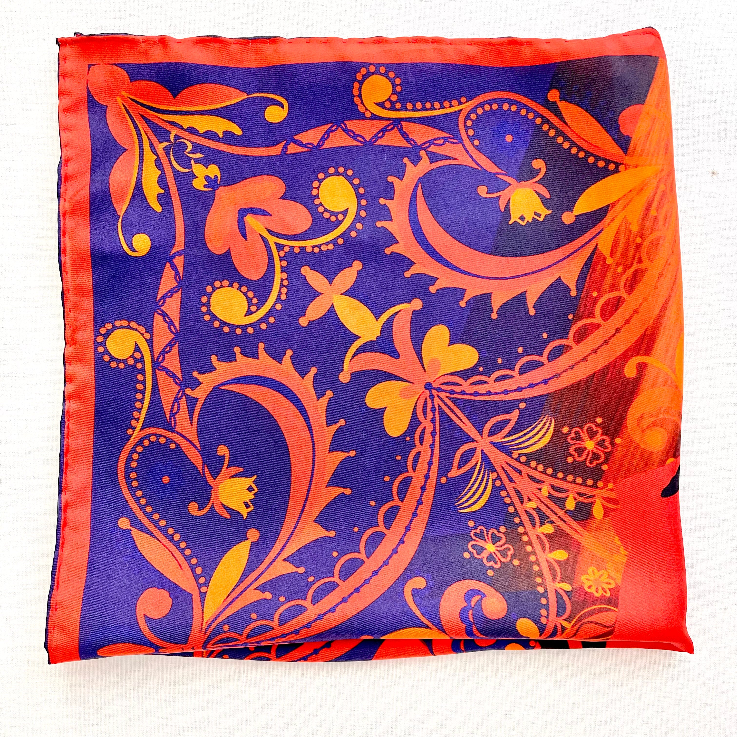 The scarf is made from 100% silk, chosen for its smooth feel, gentle drape, and natural sheen. It measures 34 x 34 inches, making it versatile to wear around the neck, as a headscarf, or styled as an accent. The hand-rolled edges add a refined, couture finish and reflect careful, traditional craftsmanship.