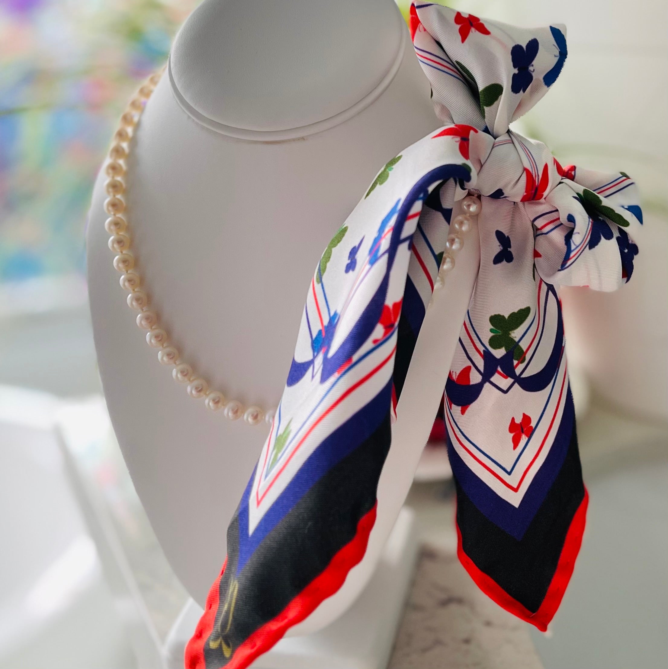 The scarf is made from 100% silk, chosen for its smooth feel, gentle drape, and natural sheen. It measures 34 x 34 inches, making it versatile to wear around the neck, as a headscarf, or styled as an accent. The hand-rolled edges add a refined, couture finish and reflect careful, traditional craftsmanship.