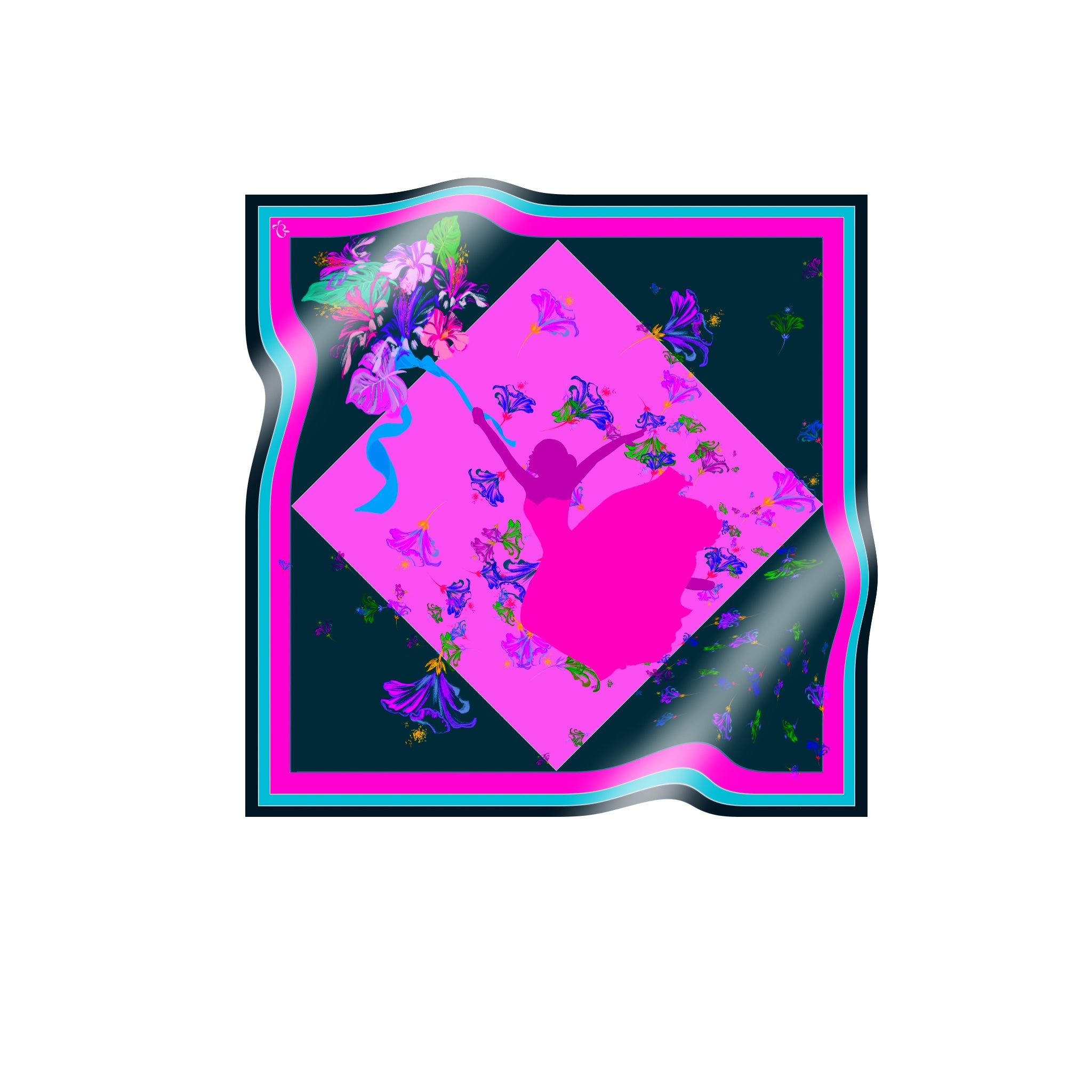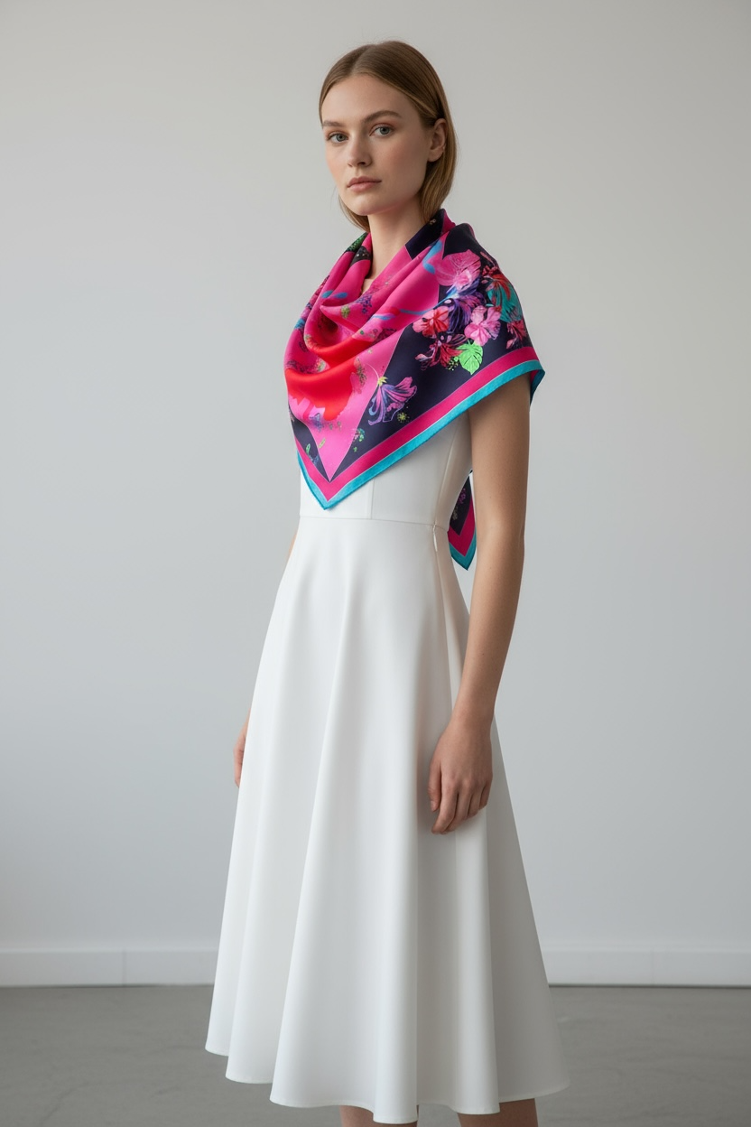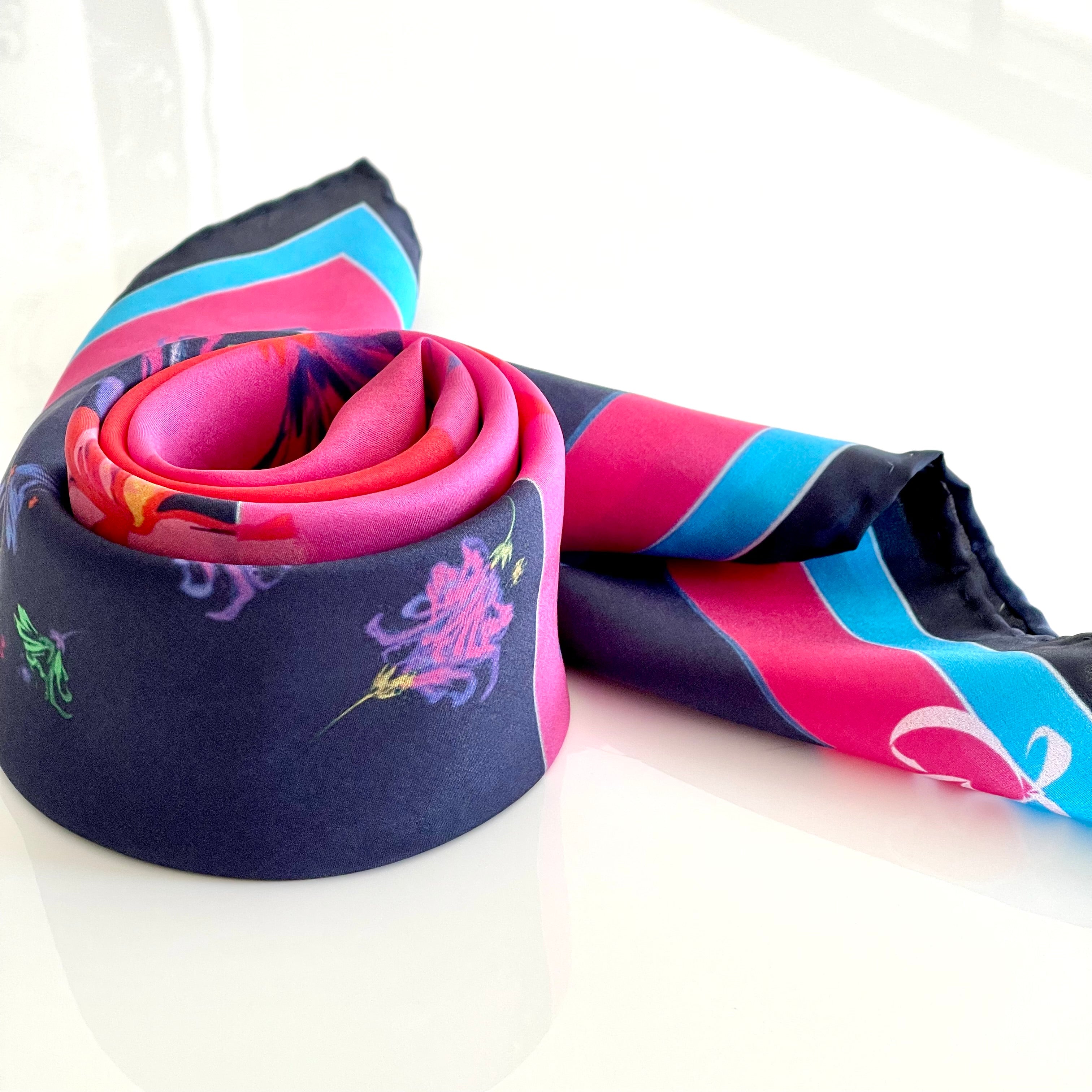 The scarf is made from 100% silk, chosen for its smooth feel, gentle drape, and natural sheen. It measures 34 x 34 inches, making it versatile to wear around the neck, as a headscarf, or styled as an accent. The hand-rolled edges add a refined, couture finish and reflect careful, traditional craftsmanship.