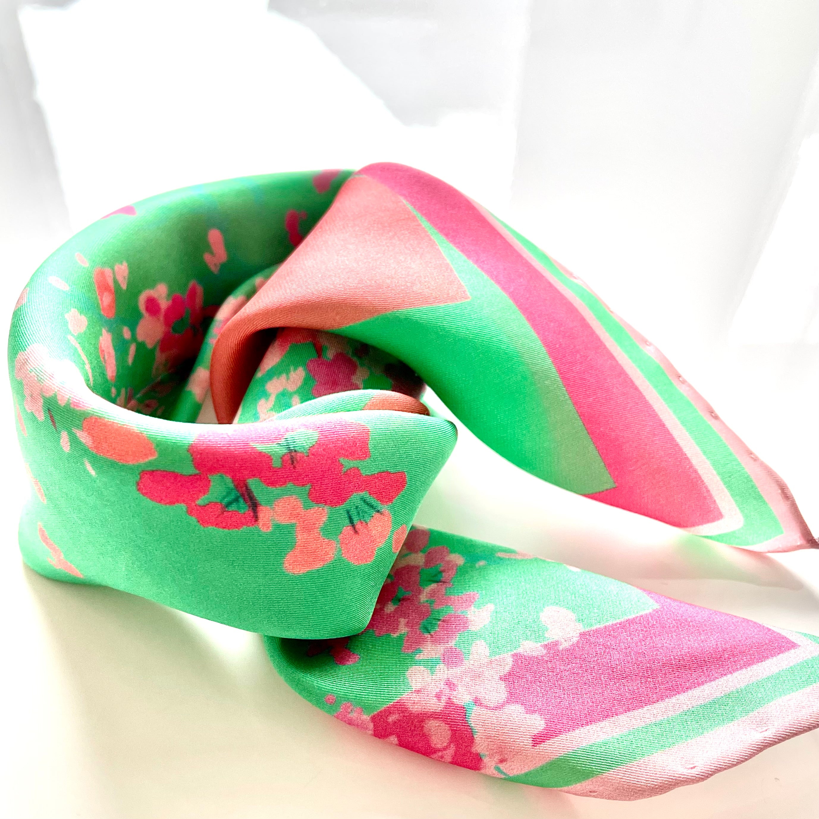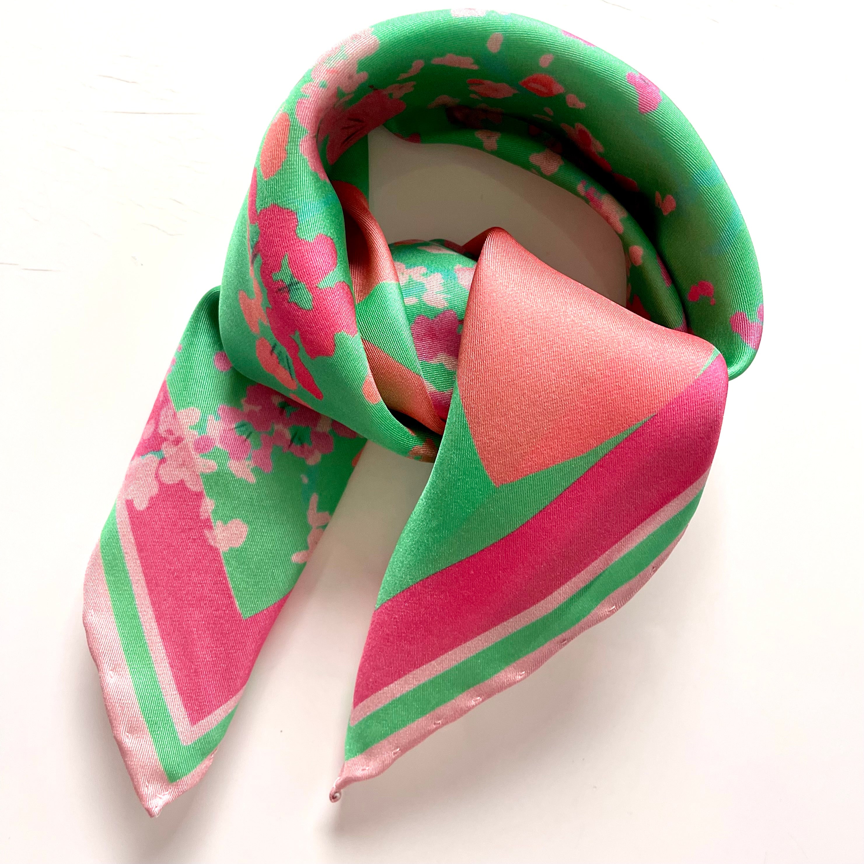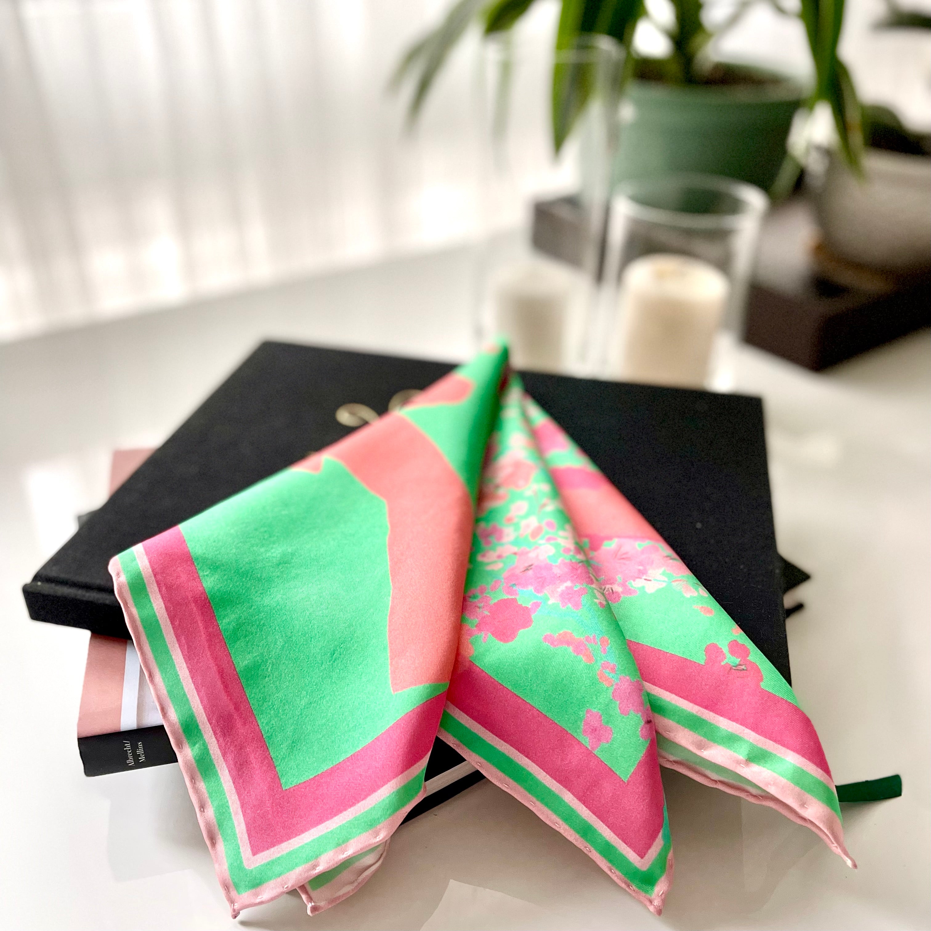 The scarf is made from 100% silk, chosen for its smooth feel, gentle drape, and natural sheen. It measures 34 x 34 inches, making it versatile to wear around the neck, as a headscarf, or styled as an accent. The hand-rolled edges add a refined, couture finish and reflect careful, traditional craftsmanship.