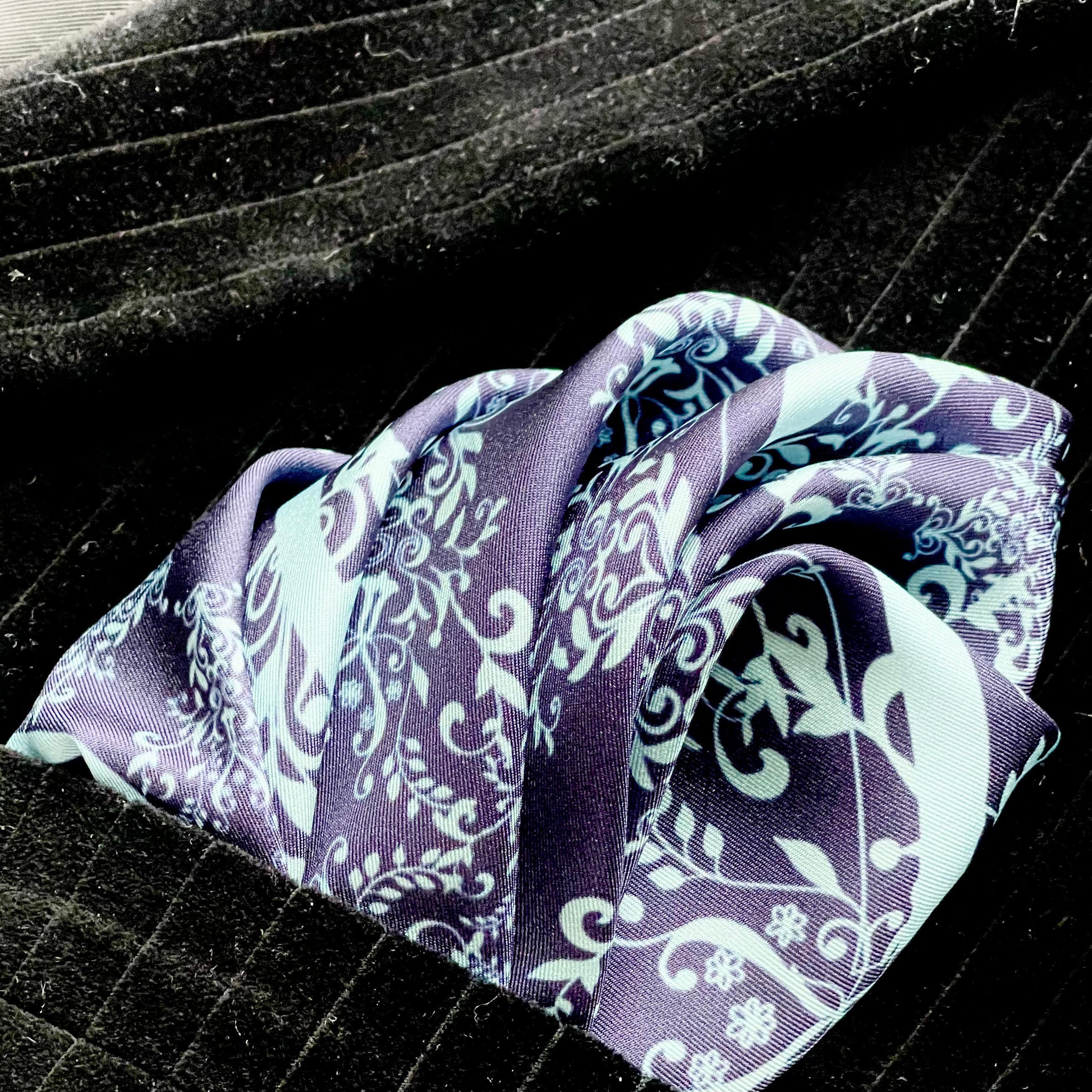 The scarf is made from 100% silk, chosen for its smooth feel, gentle drape, and natural sheen. It measures 34 x 34 inches, making it versatile to wear around the neck, as a headscarf, or styled as an accent. The hand-rolled edges add a refined, couture finish and reflect careful, traditional craftsmanship.