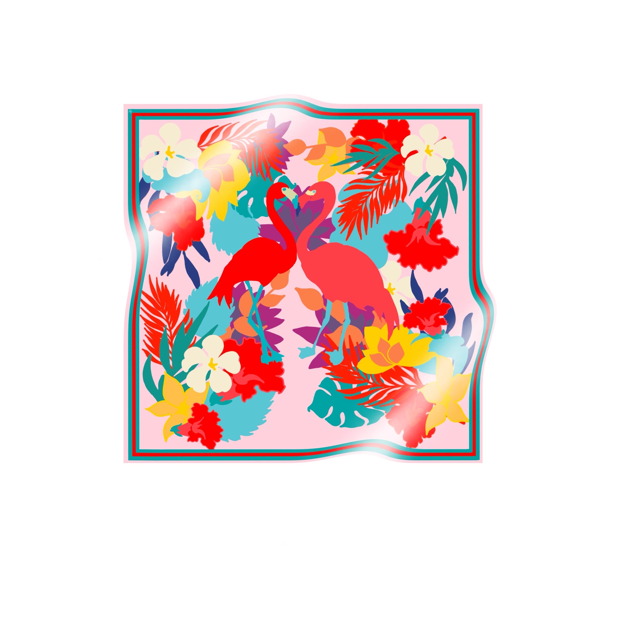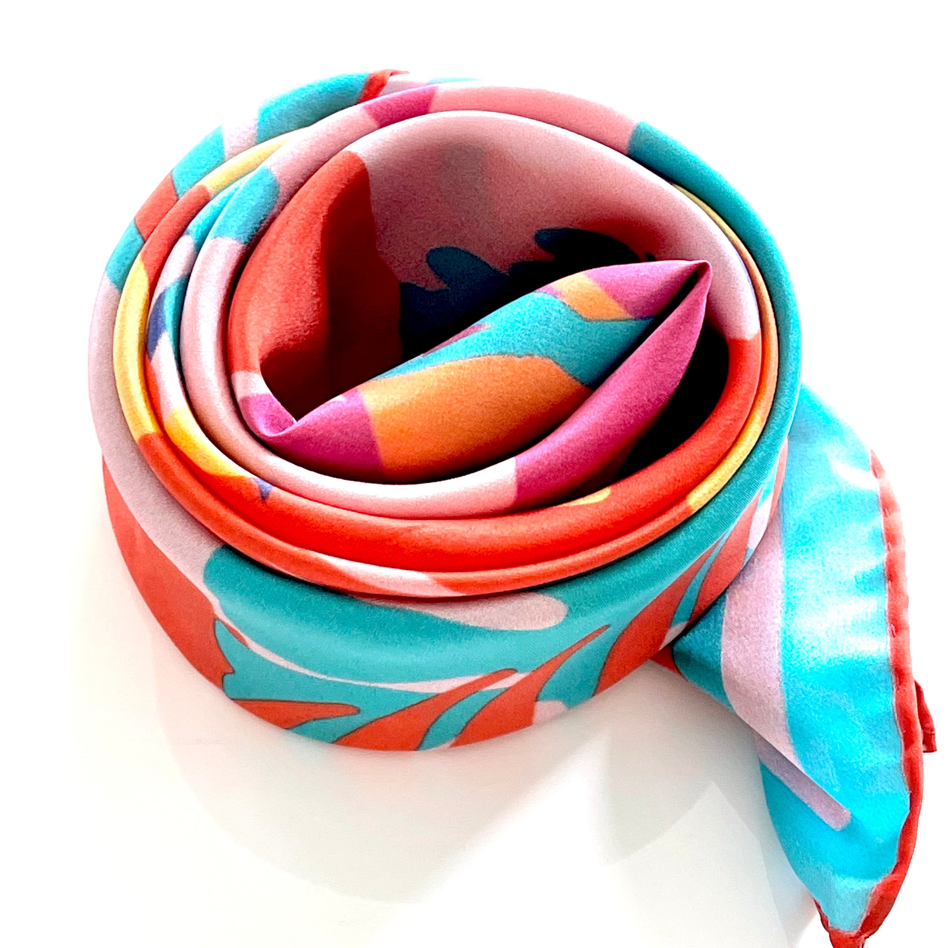The scarf is made from 100% silk, chosen for its smooth feel, gentle drape, and natural sheen. It measures 34 x 34 inches, making it versatile to wear around the neck, as a headscarf, or styled as an accent. The hand-rolled edges add a refined, couture finish and reflect careful, traditional craftsmanship.