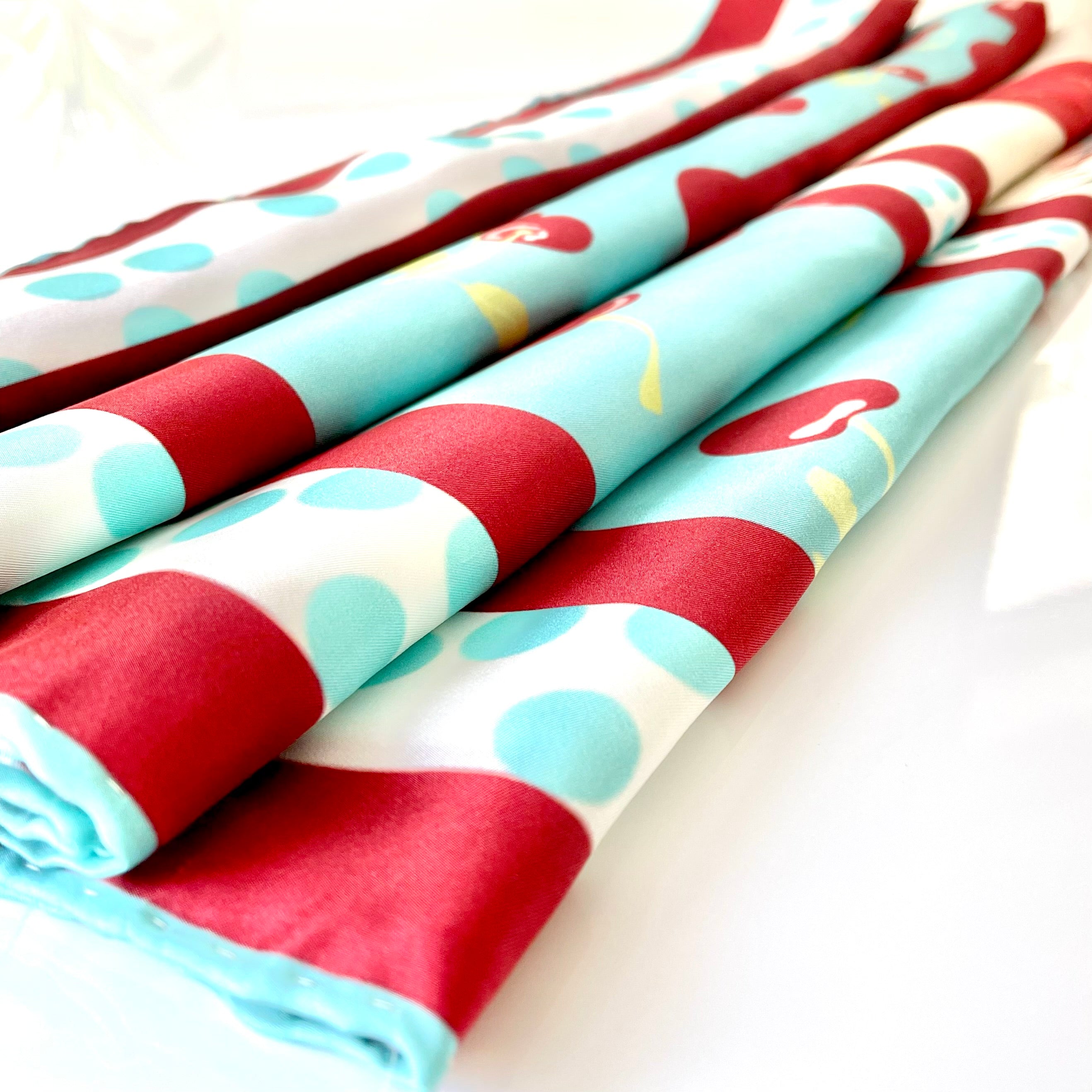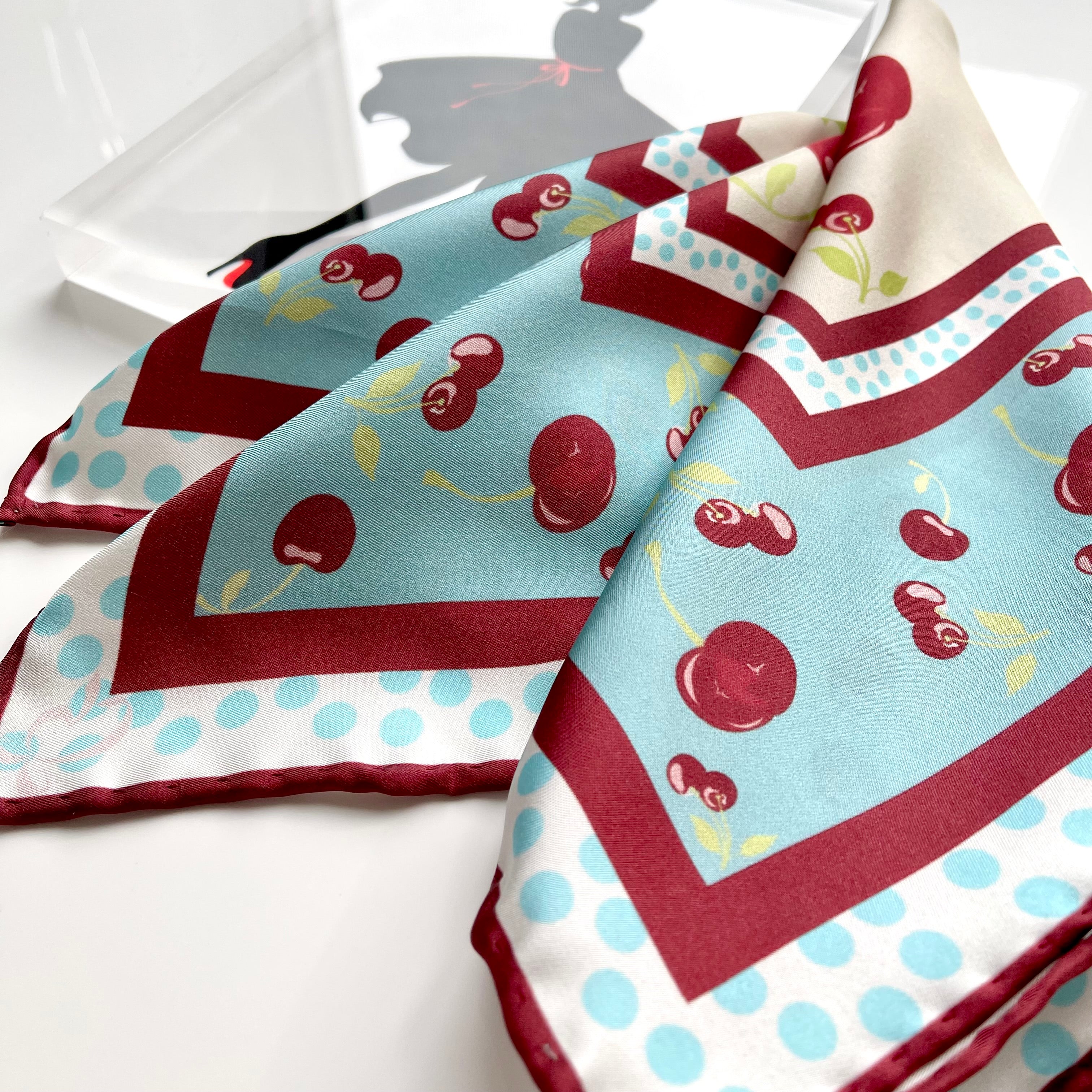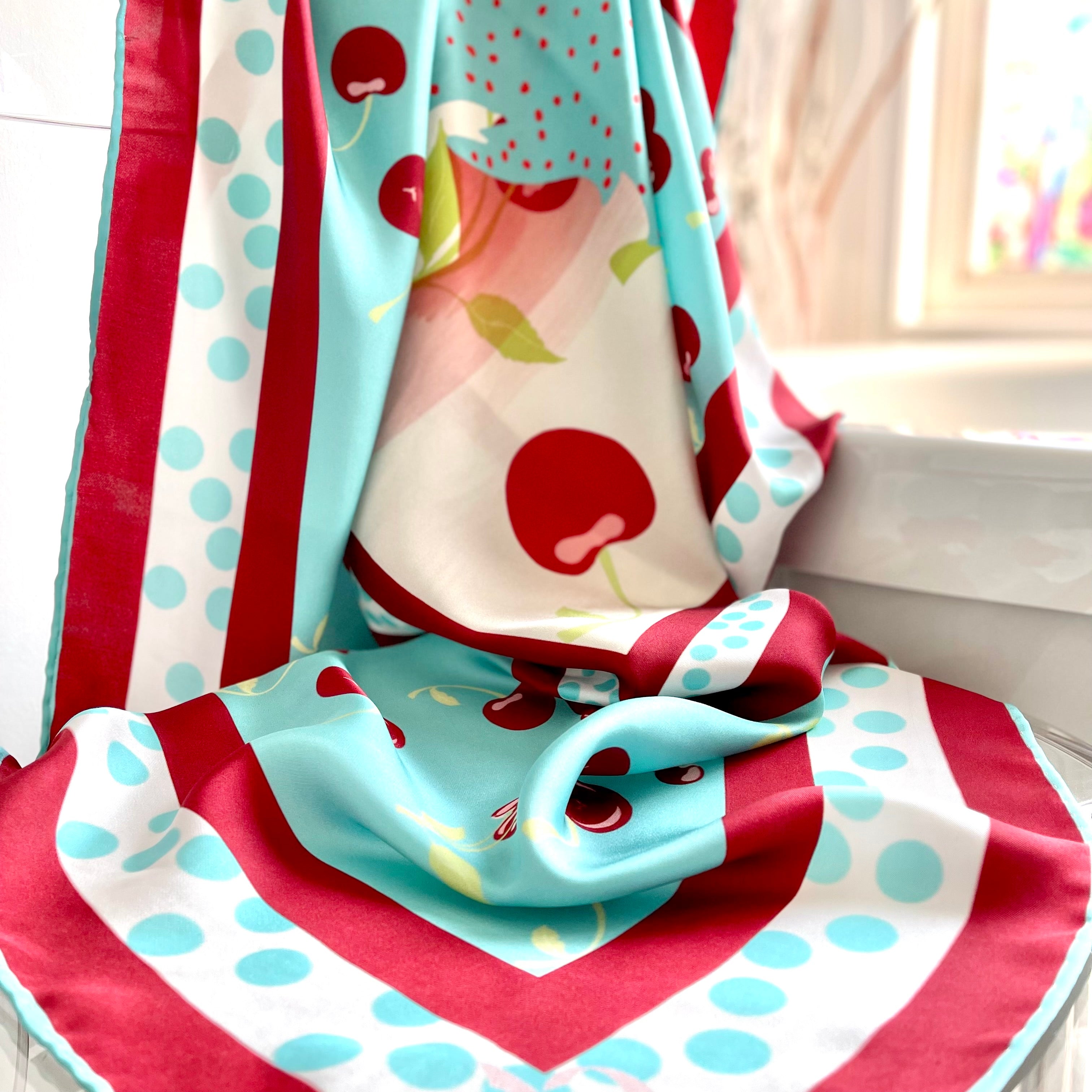 The scarf is made from 100% silk, chosen for its smooth feel, gentle drape, and natural sheen. It measures 34 x 34 inches, making it versatile to wear around the neck, as a headscarf, or styled as an accent. The hand-rolled edges add a refined, couture finish and reflect careful, traditional craftsmanship.