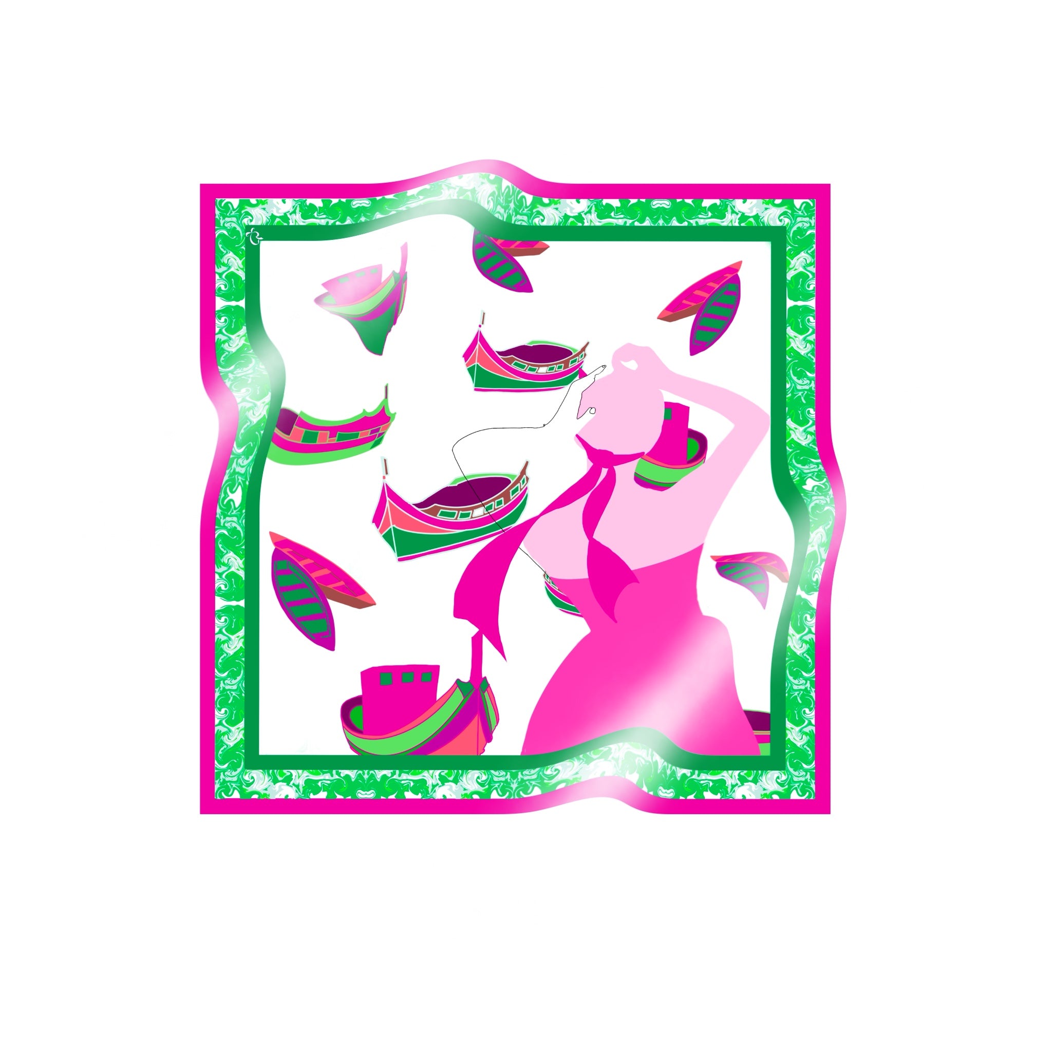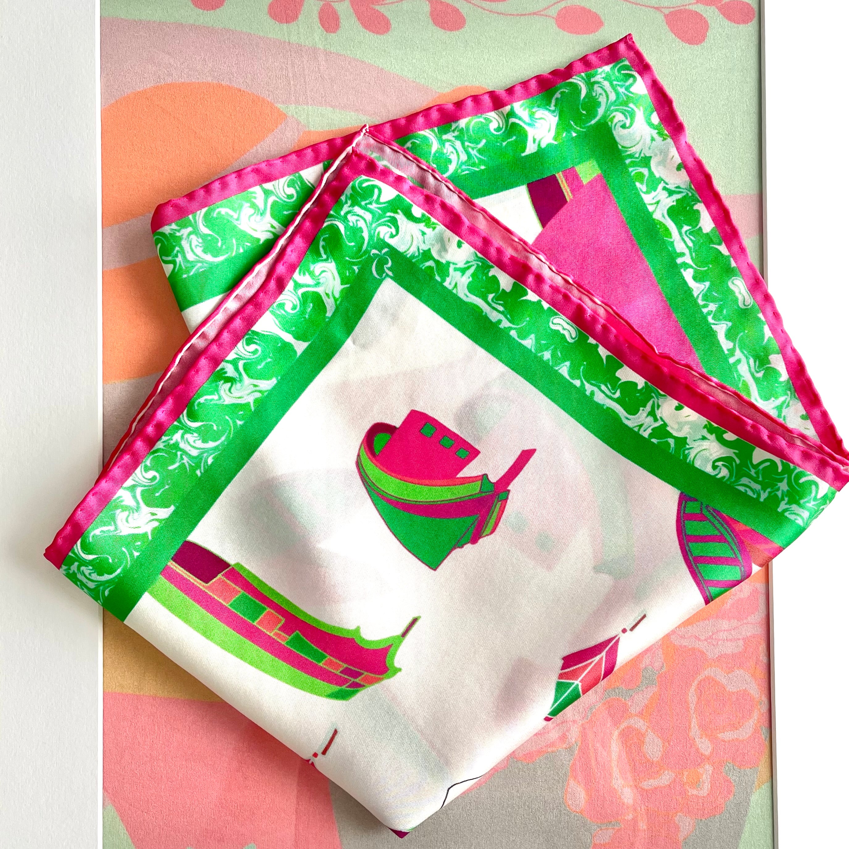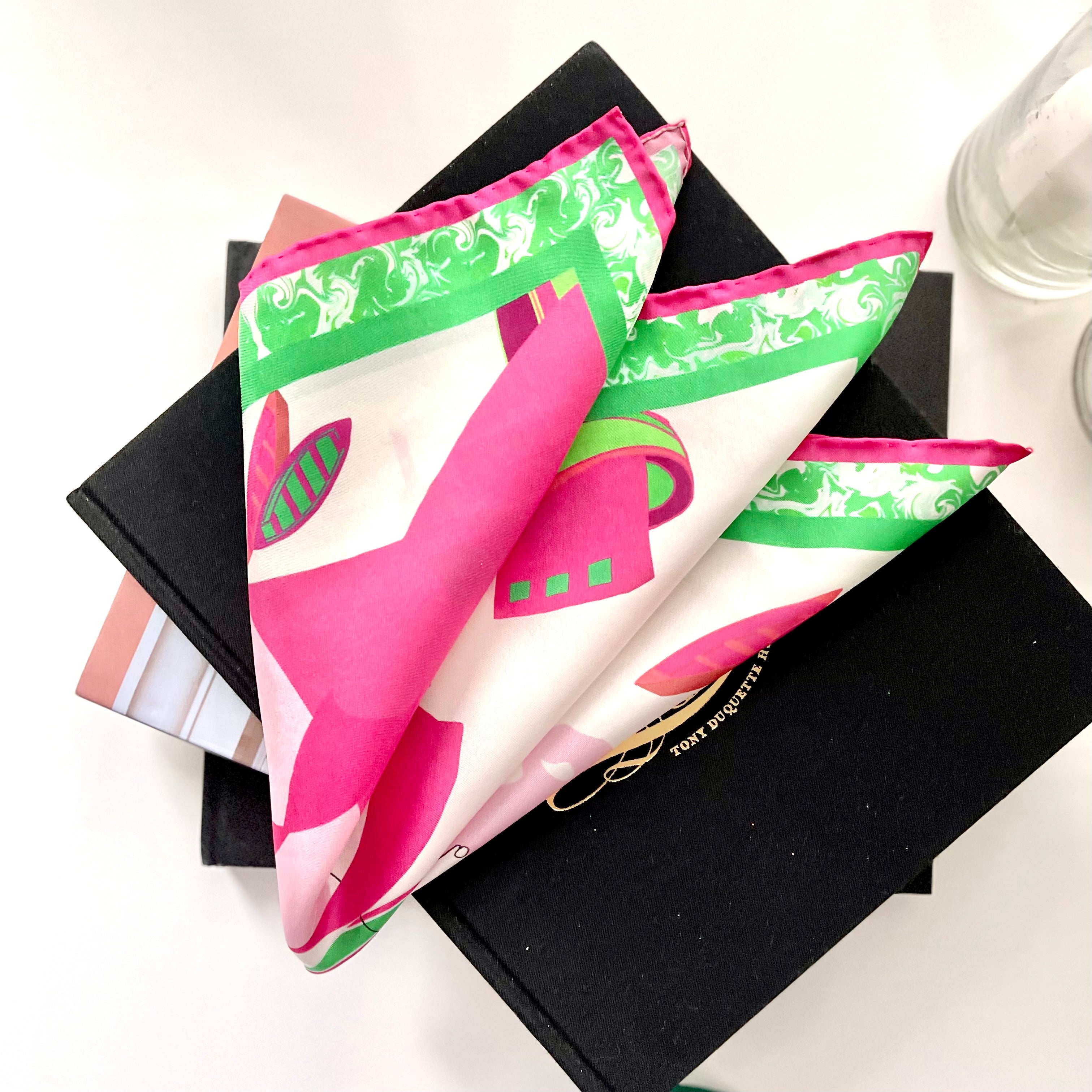 The scarf is made from 100% silk, chosen for its smooth feel, gentle drape, and natural sheen. It measures 34 x 34 inches, making it versatile to wear around the neck, as a headscarf, or styled as an accent. The hand-rolled edges add a refined, couture finish and reflect careful, traditional craftsmanship.