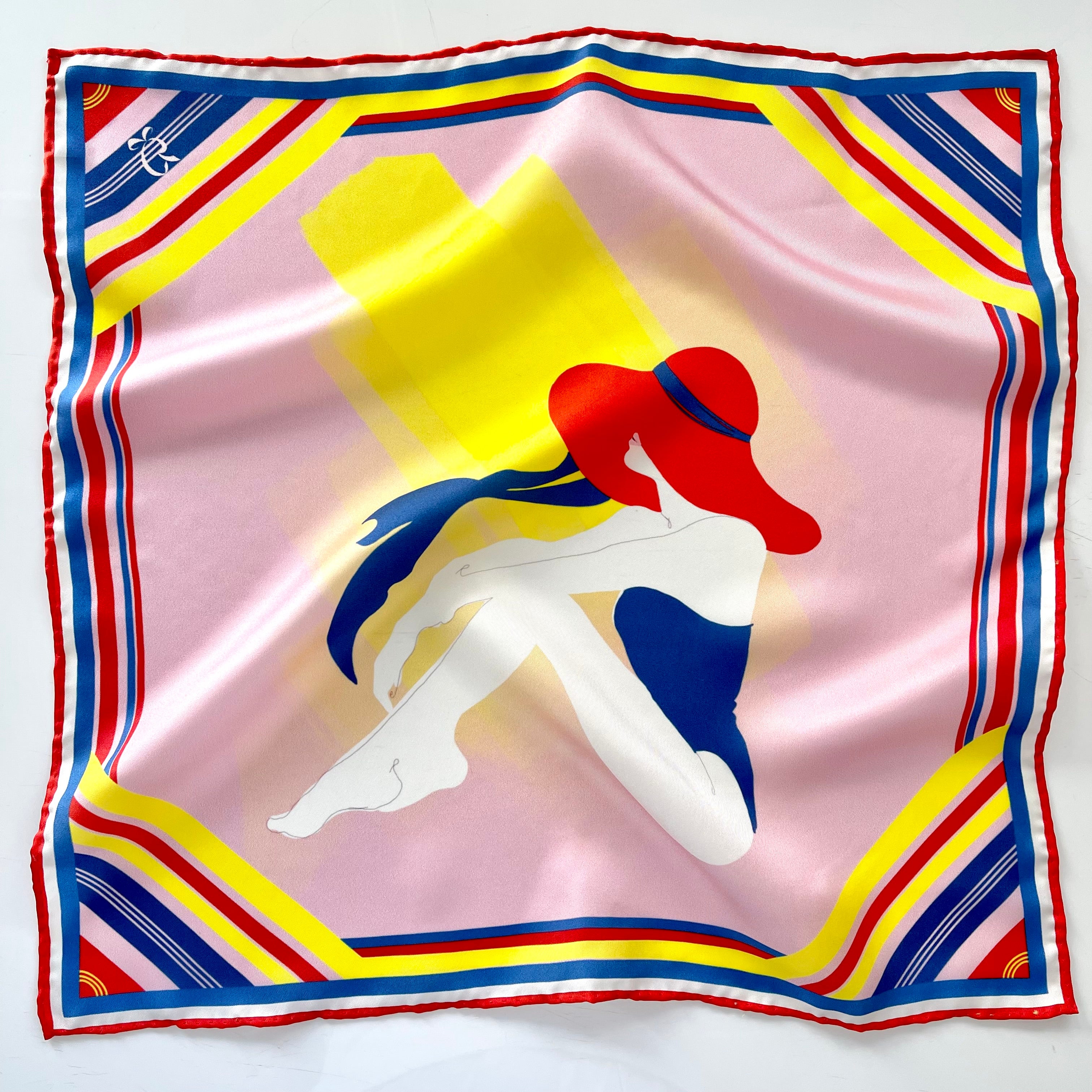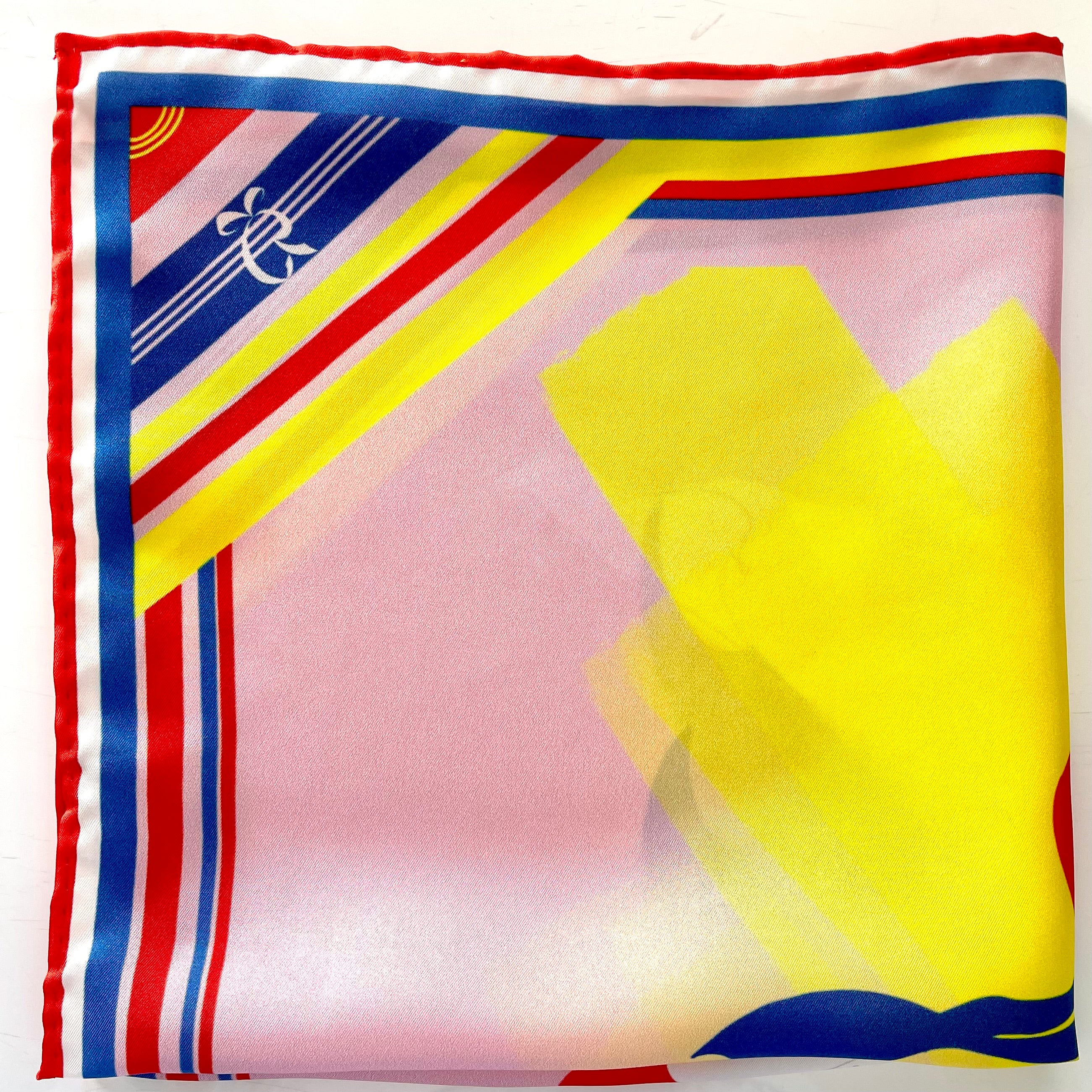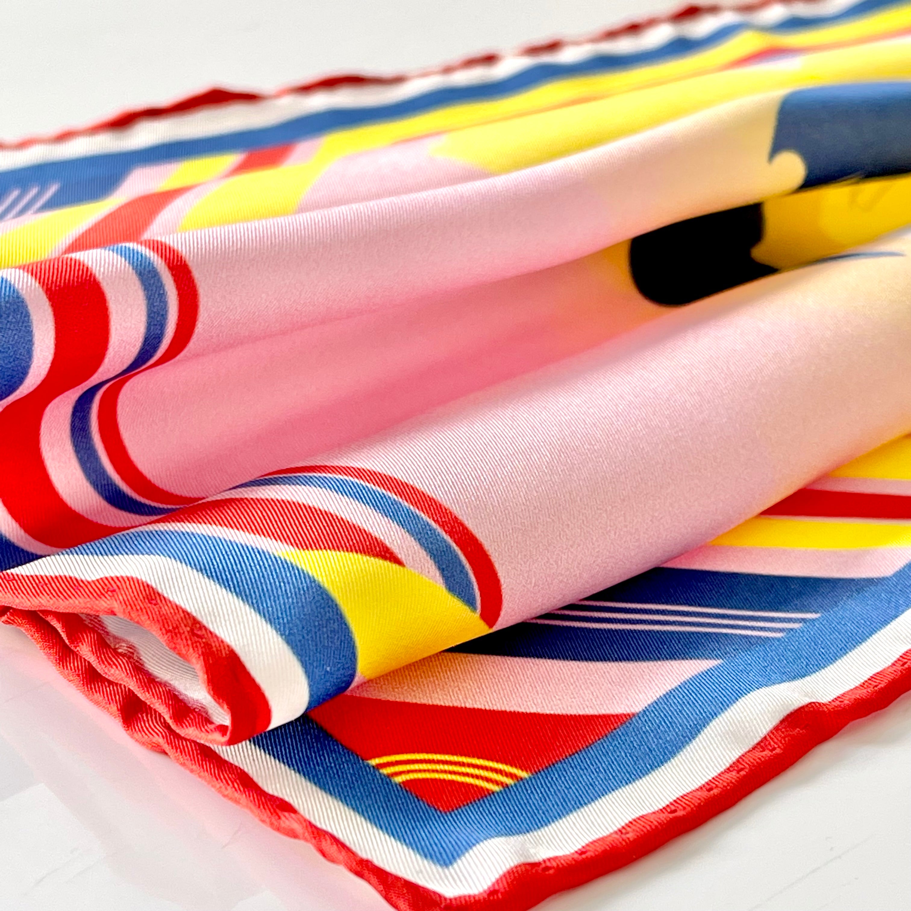 The scarf is made from 100% silk, chosen for its smooth feel, gentle drape, and natural sheen. It measures 34 x 34 inches, making it versatile to wear around the neck, as a headscarf, or styled as an accent. The hand-rolled edges add a refined, couture finish and reflect careful, traditional craftsmanship.