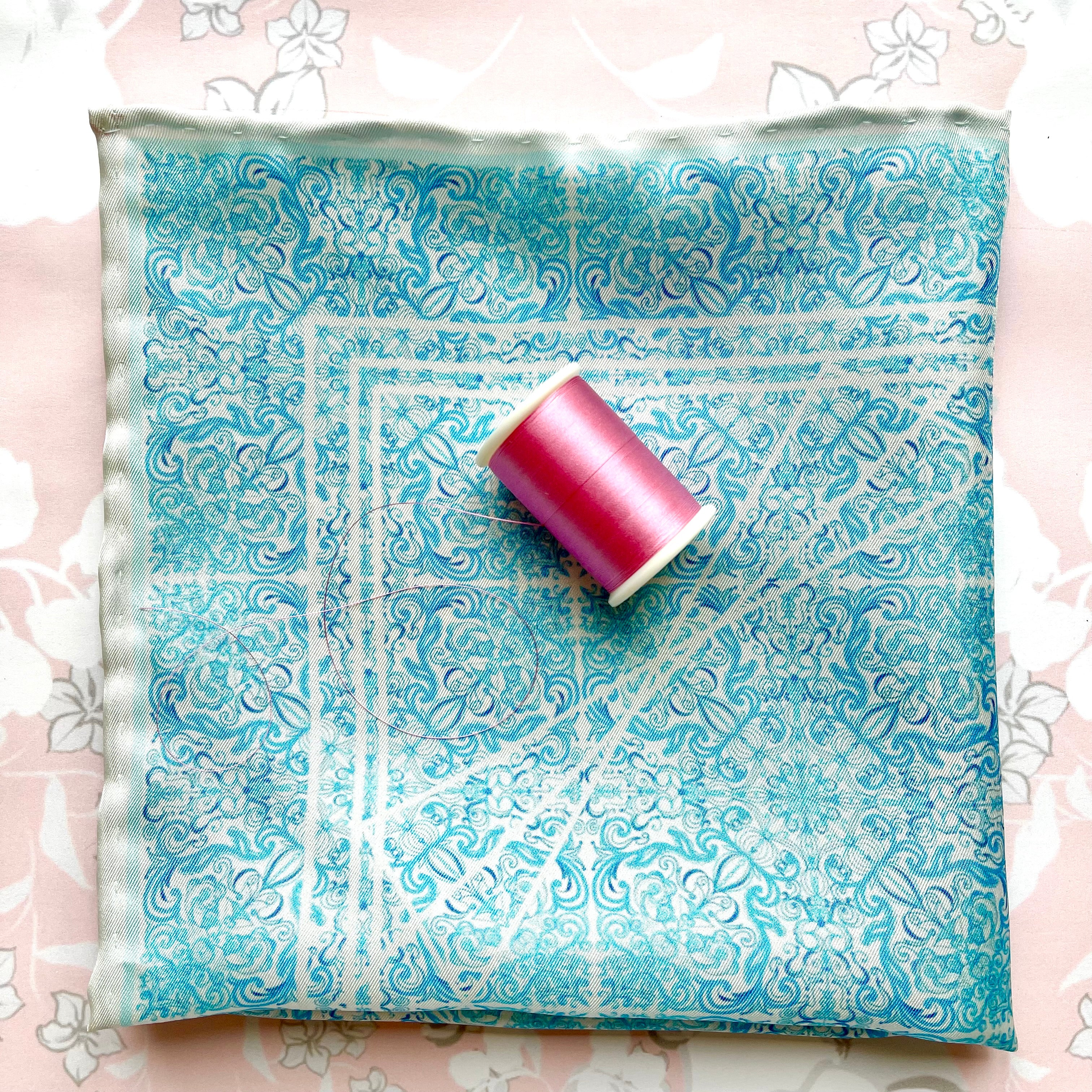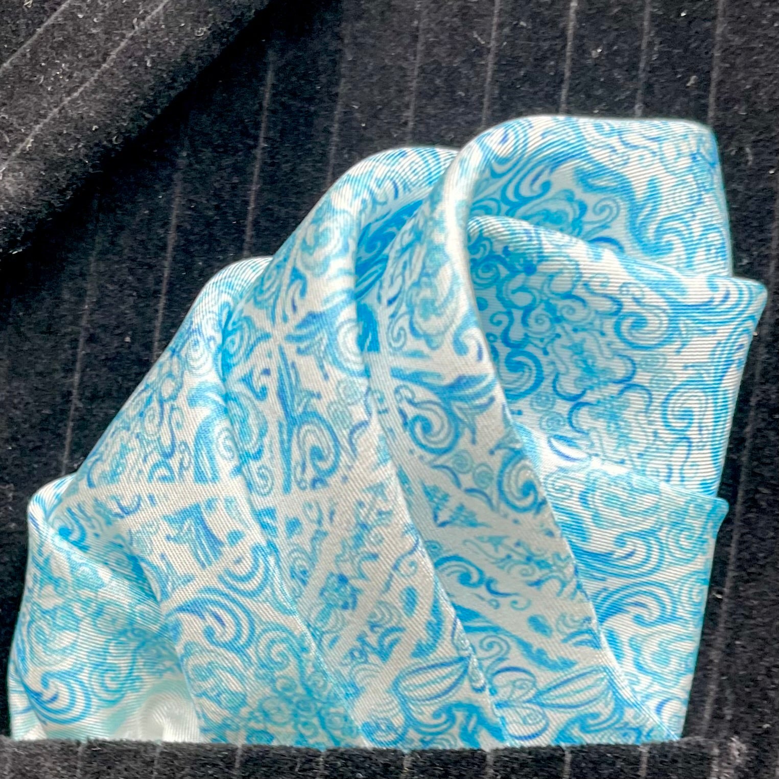 The scarf is made from 100% silk, chosen for its smooth feel, gentle drape, and natural sheen. It measures 34 x 34 inches, making it versatile to wear around the neck, as a headscarf, or styled as an accent. The hand-rolled edges add a refined, couture finish and reflect careful, traditional craftsmanship.
